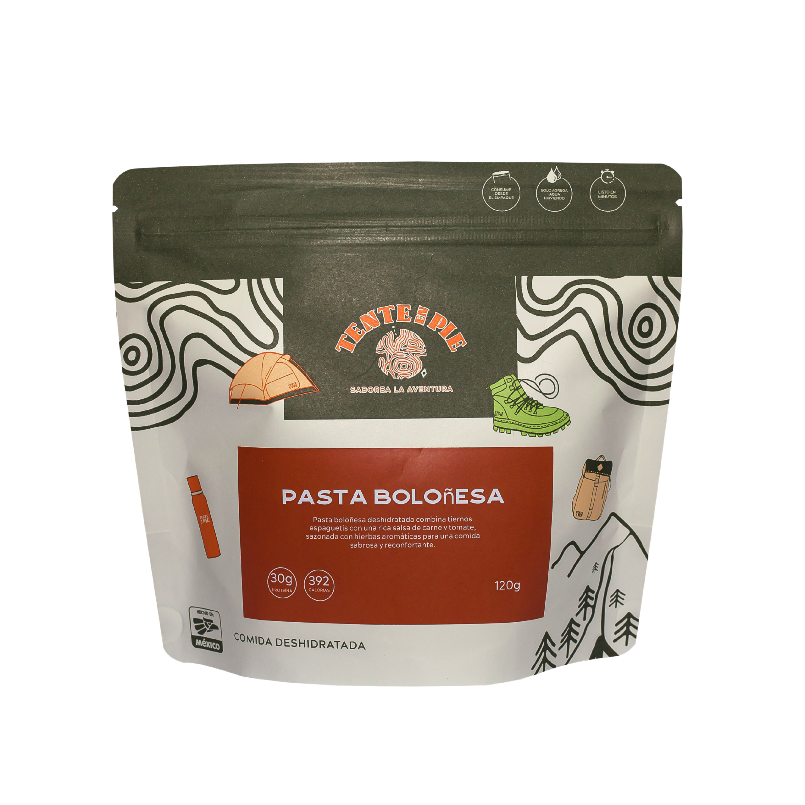 Nuestra pasta a la boloñesa deshidratada es la opción ideal para cualquier aventurero. Preparada con una salsa de jitomate natural, carne y especias cuidadosamente seleccionadas, ofrece una comida deliciosa y nutritiva lista en minutos. Ligera, práctica y reconfortante: energía y sabor para seguir la ruta.